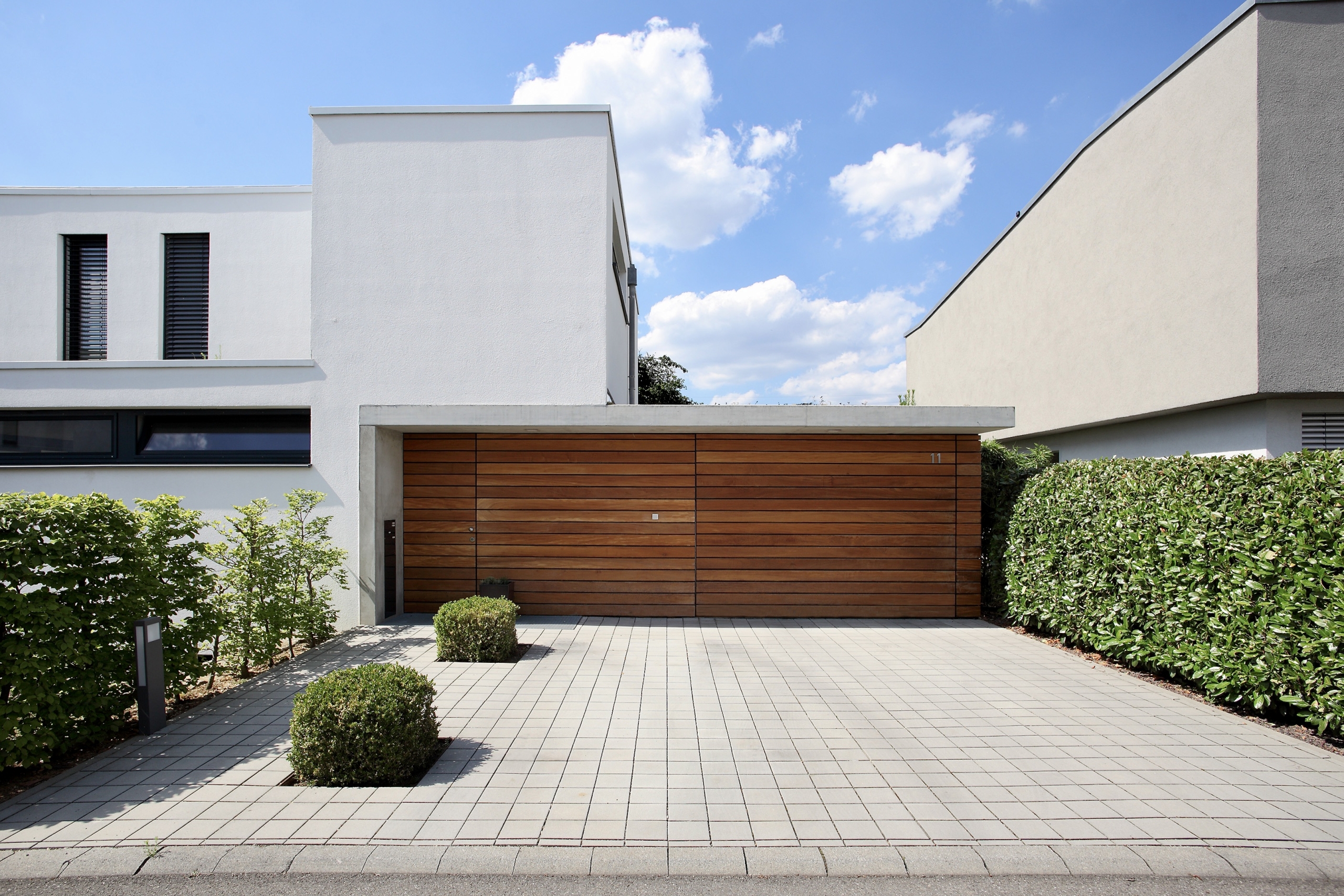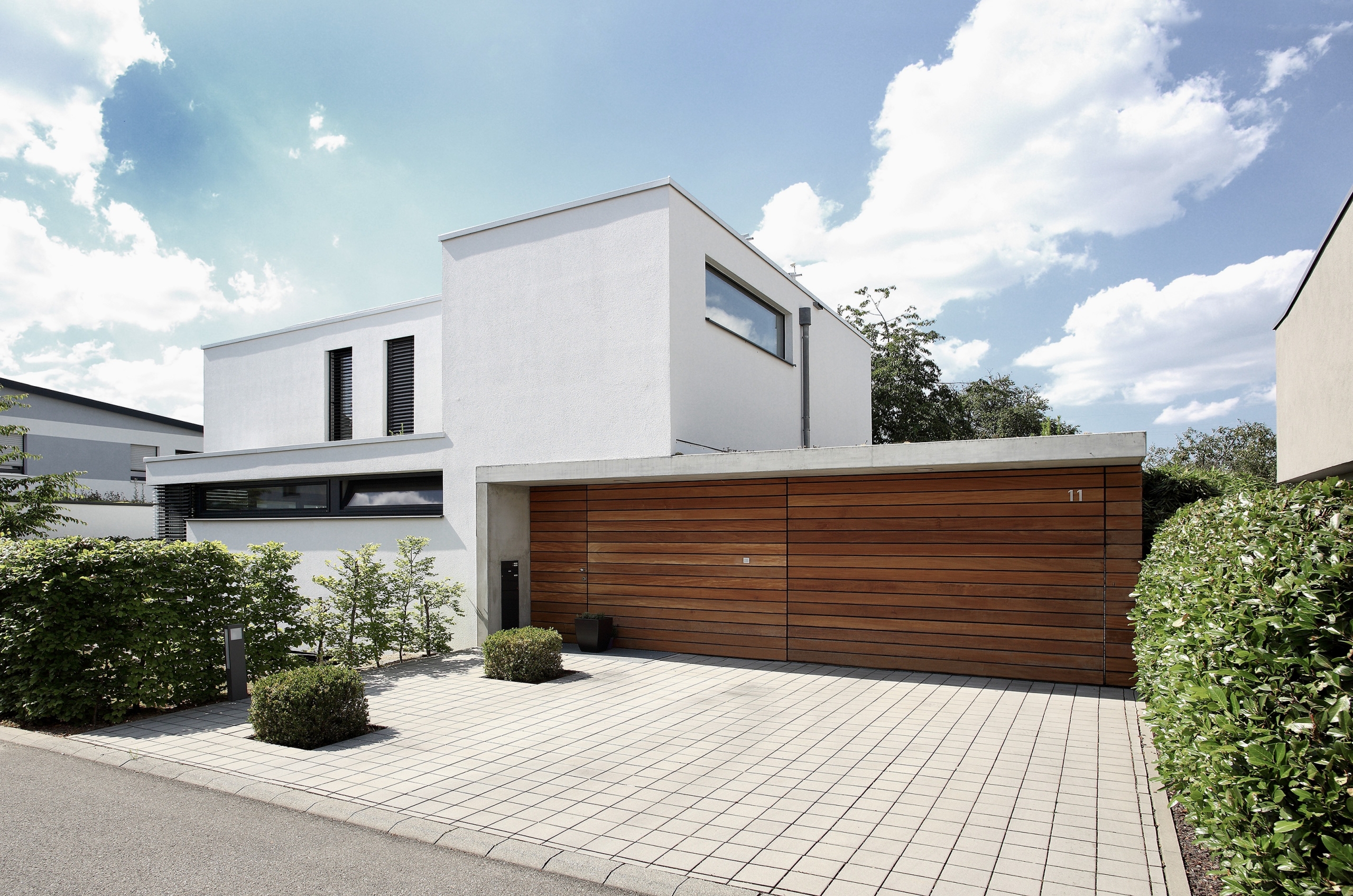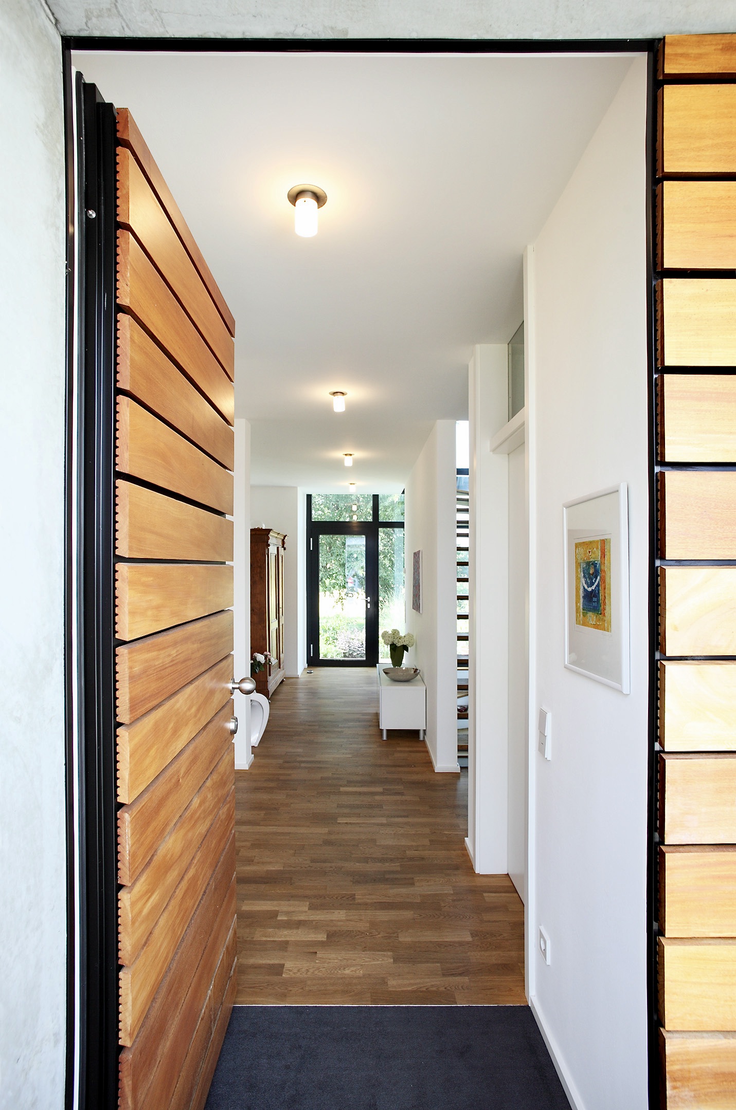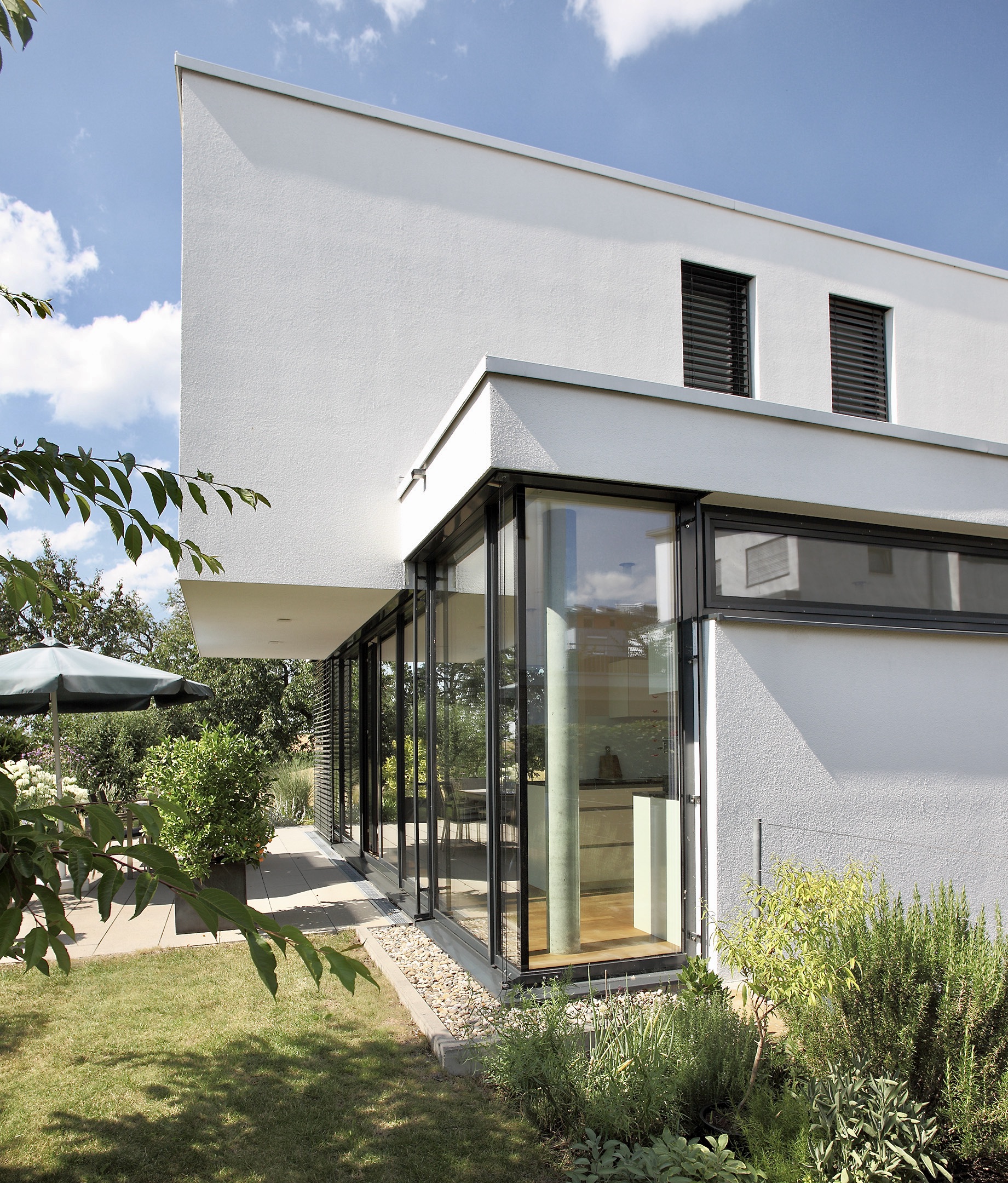 In schöner, ruhiger Stadtrandlage, im neu erschlossenen Wohngebiet Galgenberg II, wünschten sich die Bauherren ein modernes, klar gegliedertes Einfamilienhaus. Die unbebaubare Nordwestseite des Grundstücks führte zur kompromisslosen Öffnung der Fassade. Lichtdurchflutete Innenräume verbinden sich mit den Außenräumen. Zur Straße ordnen sich Nebenräume und Garage, ohne dass die Fassade an Reiz verliert. Im Gegenteil, hinter der eleganten Holzverkleidung verbirgt sich der Garagen- und Eingangsbereich mit der transparenten Treppe. Diese verbindet die drei Geschosse. Das Obergeschoss ist für die Eltern reserviert, mit Bad, Ankleide, Schlafen und Arbeiten. Im Untergeschoss liegen nach Süden orientiert und durch einen Lichthof belichtet die Gästezimmer der Familie.